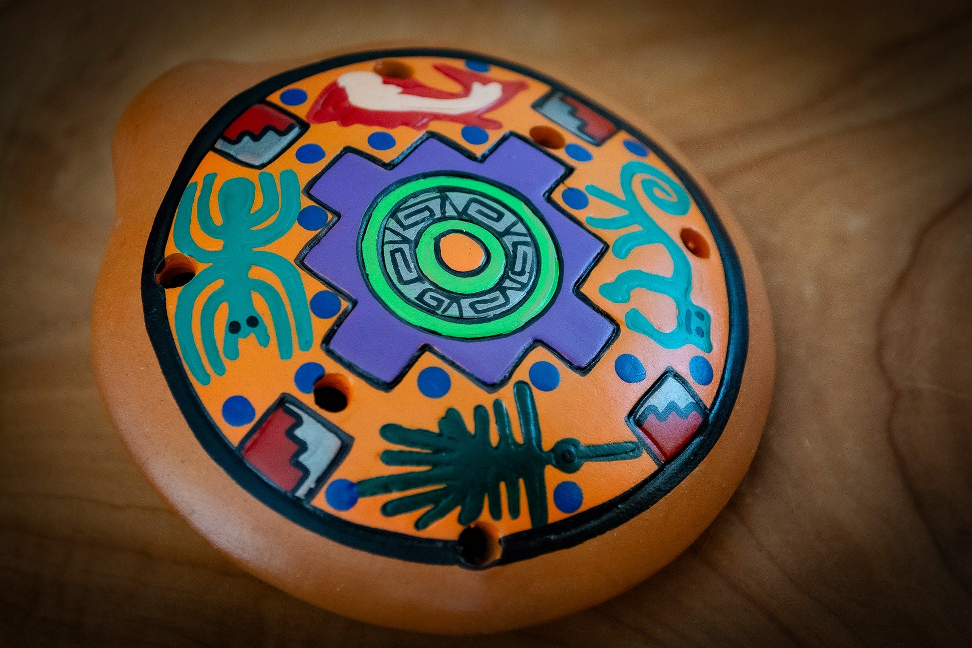 These stunning clay ocarinas are hand-painted with the gorgeous and famous Nazca Lines of Peru.